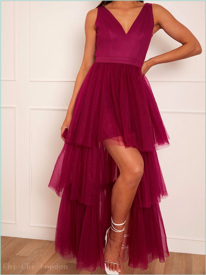 V Neck Tiered Tulle Dip Hem Dress in Berry 53354BER